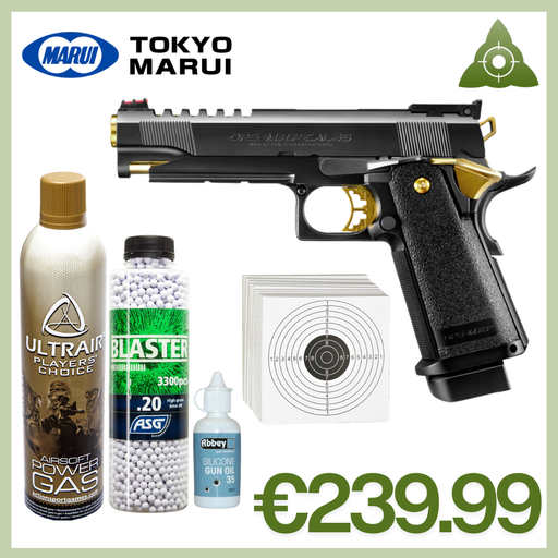 Tokyo MaruiBundle deal. Includes all the items below: Tokyo Marui HI-CAPA 5.1 - Gold Match x100 ASG paper targets Ultrair Power Gas - 570ml ASG 0.2g 3300 BBs...
