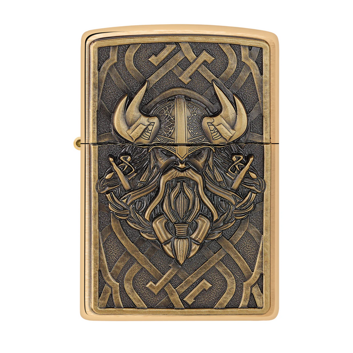 - Set on a classic Brushed Brass lighter, the luxurious emblem features an intricate Viking portrait backed by a traditional Norse knot pattern and gleams with bronze and gold plating.